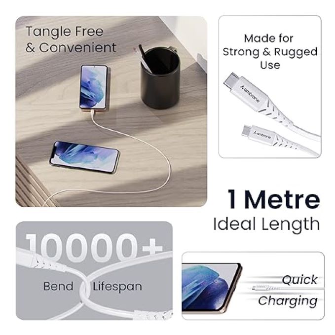 Fast Charging Cable - The cable can support upto a charging speed of 3A making it the optimal cable for Quick Charge / Rapid Charge and Turbo Charge devices. Reversible Connector – It has reversible type c connector that can be plugged in any direction, upside or downside. Durable Cable- Using only premium quality materials and a tough, durable PVC Coating, the Ambrane USB cable is built for connecting and disconnecting over and over again without signal loss. High Speed Data Transfer- 480 Mbps data transfer speed allows you to sync the data to the computer or other USB devices within few seconds.