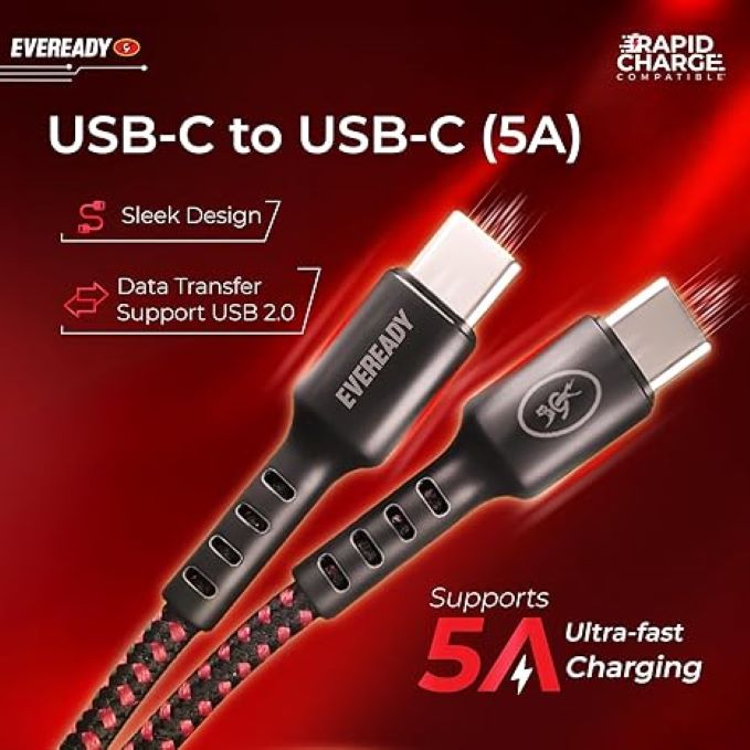 5A RAPID CHARGING SUPPORT: Delivers ultra-fast charging, perfect for power-hungry devices including smartphones, tablets, and laptops. PREMIUM BRAIDED DESIGN: Built with a rugged nylon braided exterior for enhanced durability and reduced wear over time. Offers a stylish black-red design that stands out. BEND PROTECTORS FOR LONG LIFE: Reinforced at stress points with built-in bend protectors, this cable is tested to withstand over 10,000 bends for long-lasting use. UNIVERSALLY COMPATIBLE: Supports all USB Type-C enabled devices - laptops, tablets, Android phones, and more.