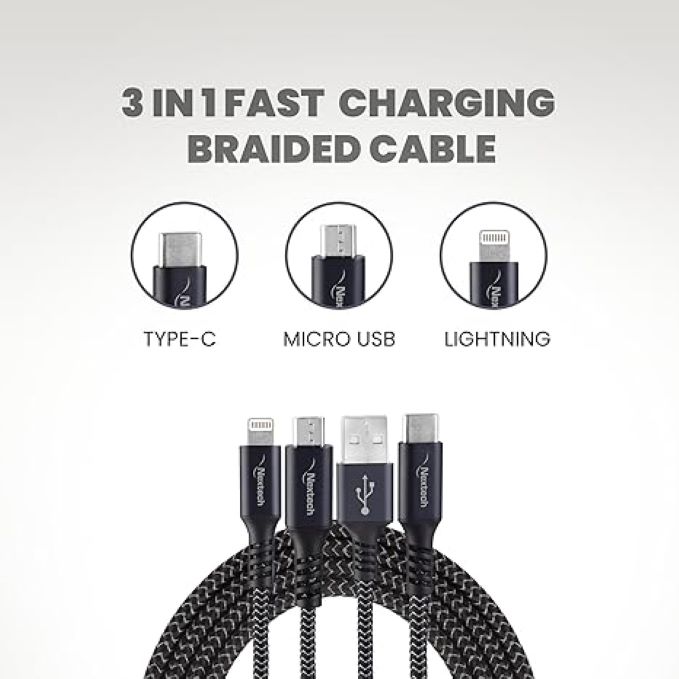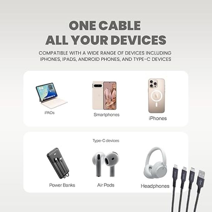 LIGHTNING-FAST CHARGING & DATA TRANSFER With Type C cable fast charging and micro USB cable fast charging speeds, power up devices 70% faster than regular cables. Stop waiting—start charging instantly! CHARGE & SYNC 3 DEVICES SIMULTANEOUSLY No more tangled mess! This 3 in 1 USB Fast Charging Cable supports Type C, Lightning & Micro USB—charge multiple devices at once with fast charging cable speed. Stay powered anywhere, anytime!UNMATCHED DURABILITY – BUILT TO LAST Say goodbye to cheap, breakable cables! This durable & tangle-free USB C cable fast charging is 5X stronger with reinforced connectors & braided design. Outlasts regular charging cables—guaranteed!
