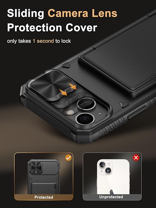 Vihibii case for iphone 15 Plus/ iPhone 14 Plus adds RFID Blocking technology, which protects your card or credit card information from theft by blocking RFID signals with innovative blocking material and preventing unauthorized scanners. You can enjoy yourself while traveling and shopping without worrying about information security problems ?Sliding Camera Lens Protection Cover?The newly designed sliding camera protective cover is 2mm thick and the sliding rail is sensitive. When you don't need to use the camera, just slide the cover for one second to cover the camera lens to Protect your iphone 15 Plus/ iPhone 14 Plus phone lens from scratches and damage ?Military-Grade Drop Protection?(1)The edges of the case are made of silicone combined with the airbag shock-absorbing structure design at the four corners, effectively resolving strong external impacts and giving your phone a real sense of security. (2)The bezel is slightly higher than the screen by 2mm, preventing the screen from entering direct and intimate contact with the ground when the phone is dropped from the front