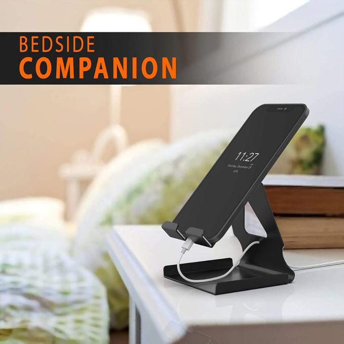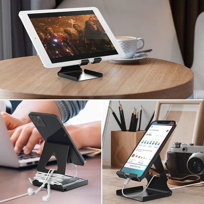 Metal phone stand: This Phone stand is portable, lightweight and it works perfectly well with almost all phones. Wide compatibility: Compatible with all mobile phones (all size), eBook readers and most tablets (up to 7 inch), even with the heavy case on Perfect for watching movies and reading: Cell phone stand perfect for desk or table to watch movies, read, sync charging your phone Anti-Skid Rubber protection: The Anti-Skid rubber protection at the bottom of the stand keeps your device from scratches and sliding