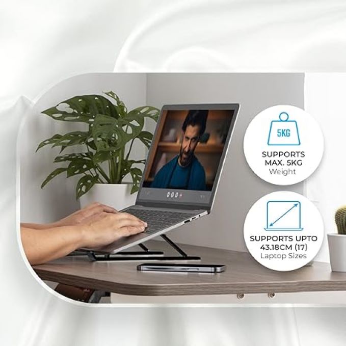 Ergonomic design: The ZEB-NS1000 laptop stand, with its foldable and ergonomic design, is perfect for remote work and workcations. Portability: This stand is easily portable and can be easily carried anywhere. Capacity: can withstand a maximum weight of 5 kg, capable of holding a laptop of up to 43.18 cm(17 inches). Anti-slip silicone Rubber pads: For better grip and holding, the stand is designed with anti-slip silicone rubber pads, so that the laptop does not slide easily when inclined. Adjustment: This stand is designed with 6 adjustable levels to minimize eye strain.